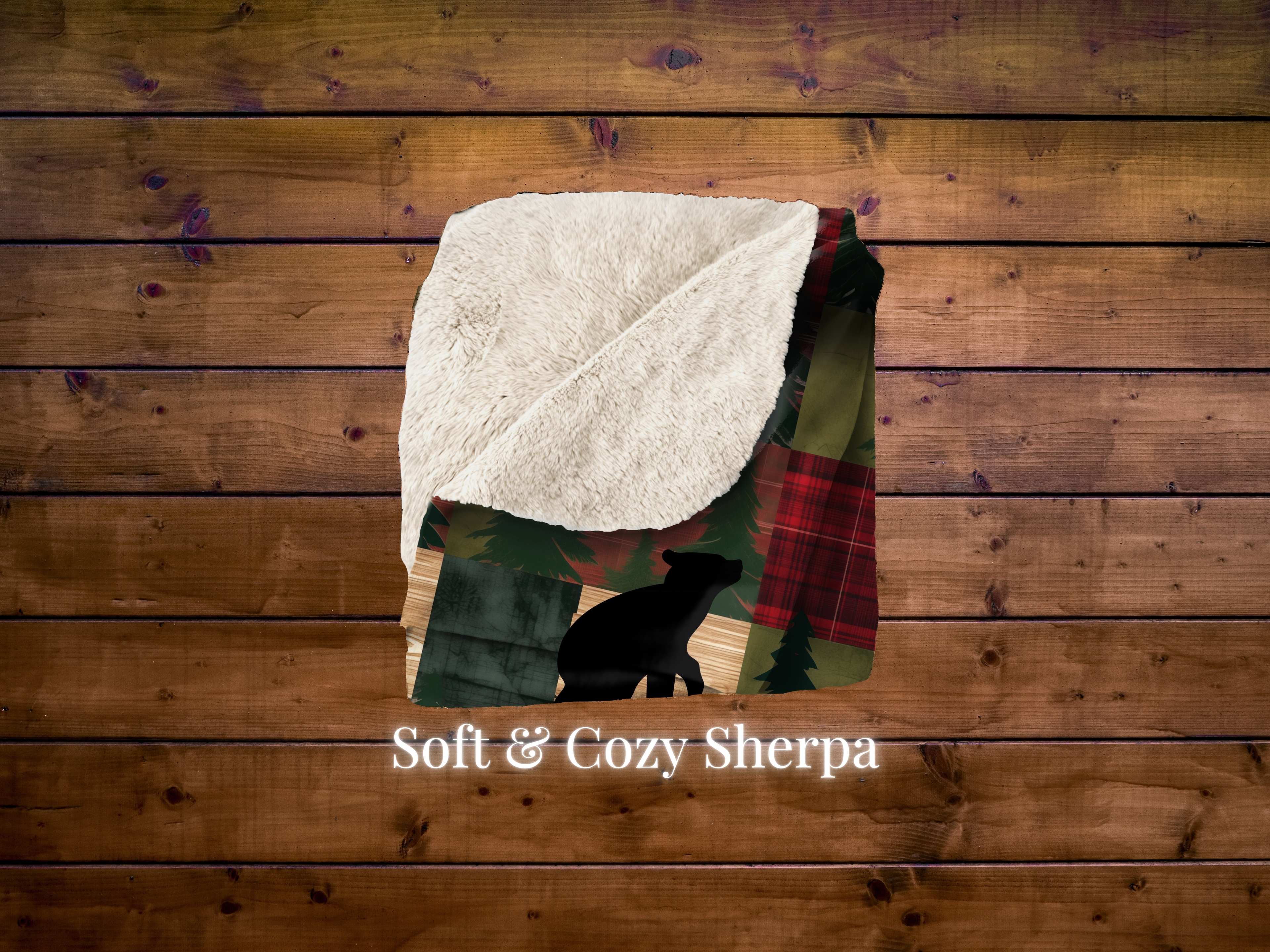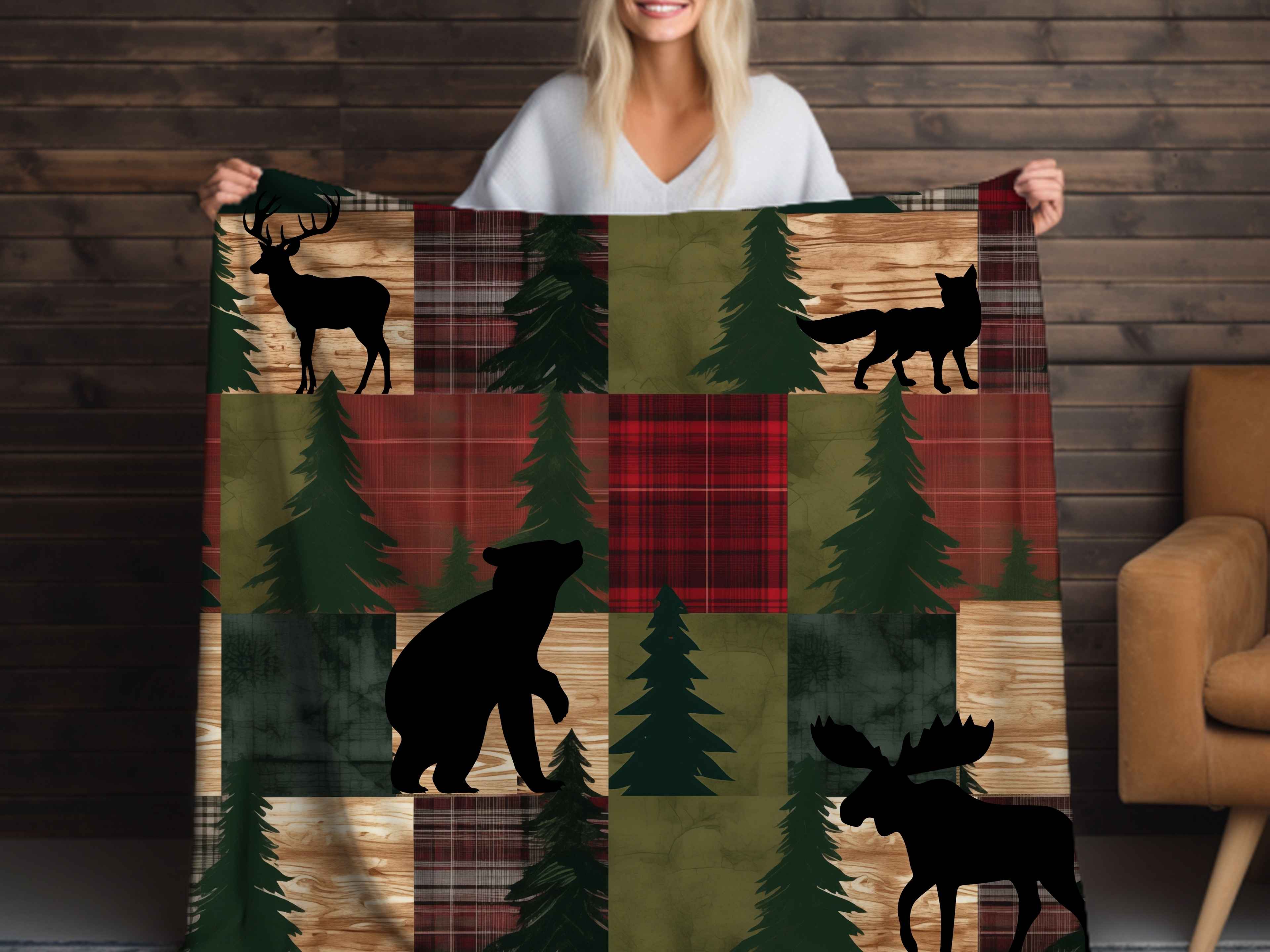 Sherpa Throw Blanket - Rustic Woodland Patchwork with Bear, Moose, Deer & Fox Cozy Cabin Lodge - Soft Plush Throw Blanket
