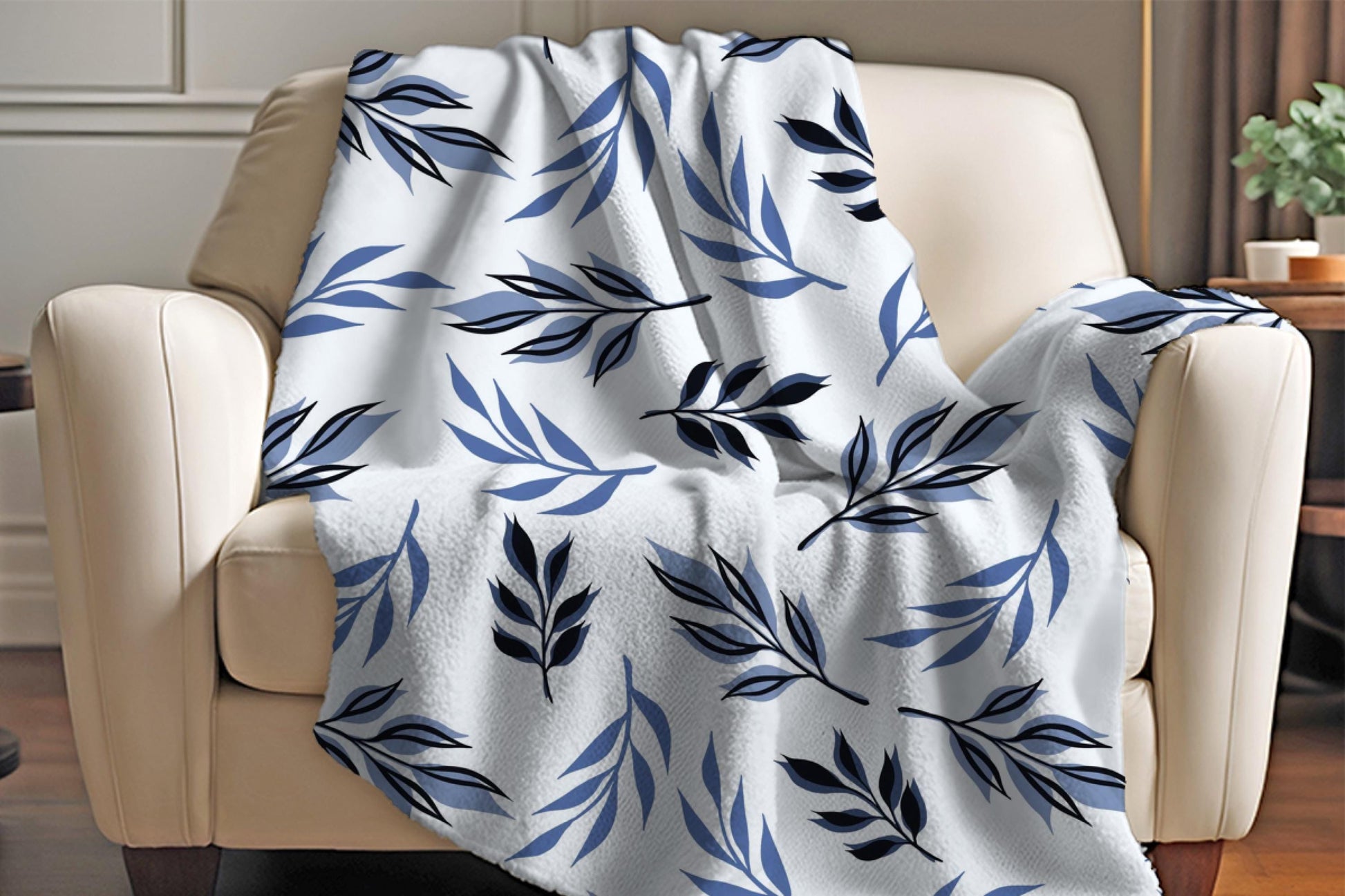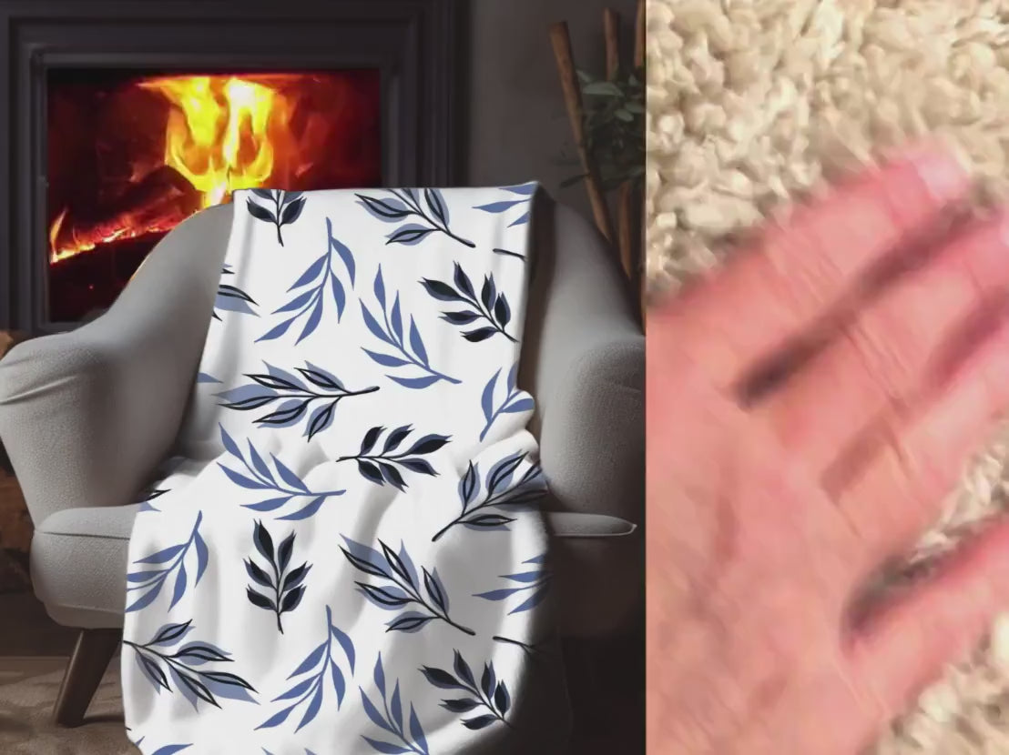 This sherpa blanket showcases a clean, minimalist design of watercolor-style blue and black leaf sprigs on a crisp white background. Lightweight yet warm, it's perfect for curling up in a reading nook, styling a modern sofa, or adding a calm botanical accent to your bed.