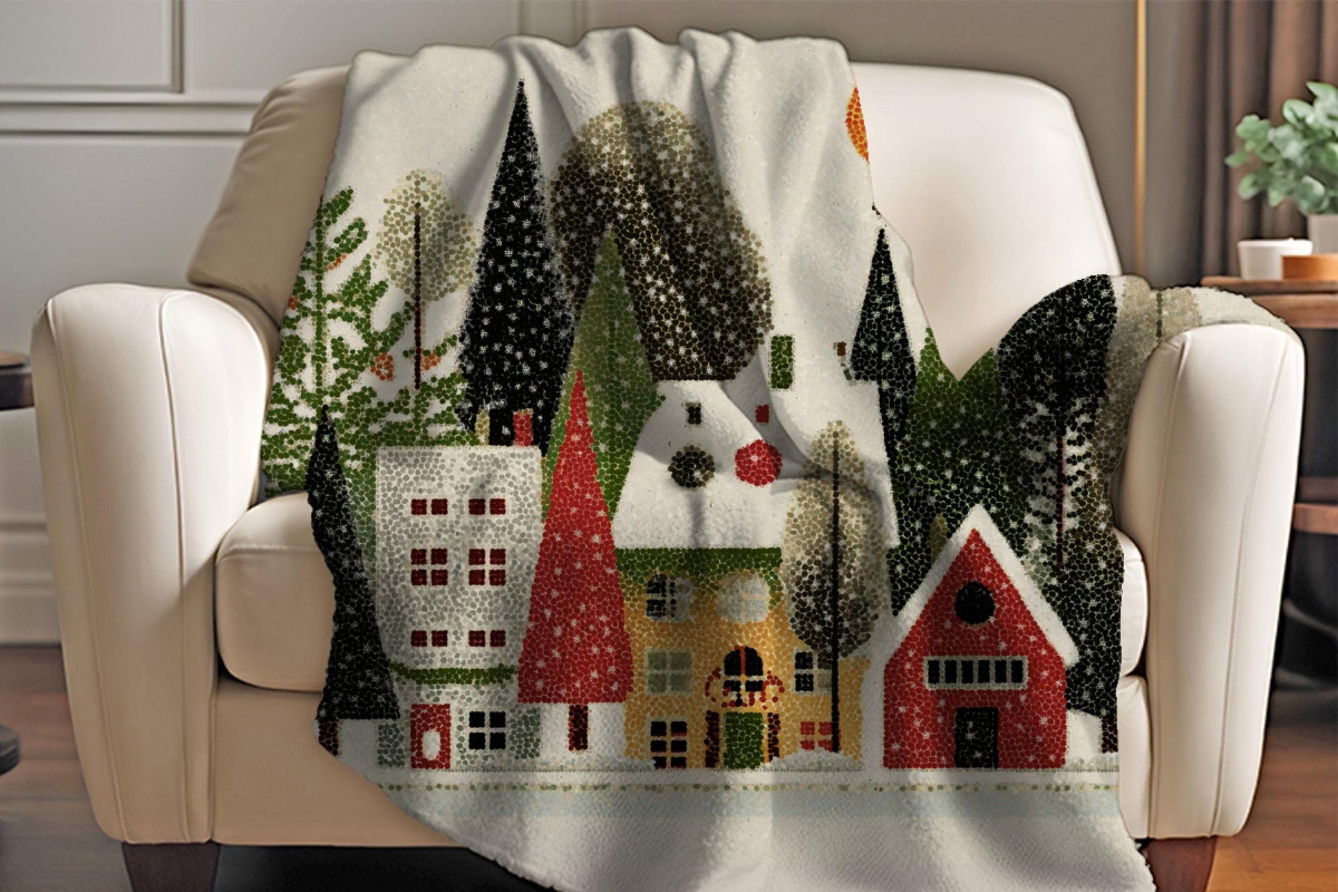 Cozy Christmas Village Sherpa Blanket – Snowy Forest Winter Scene Throw | Holiday Home Décor in Pointillist Style