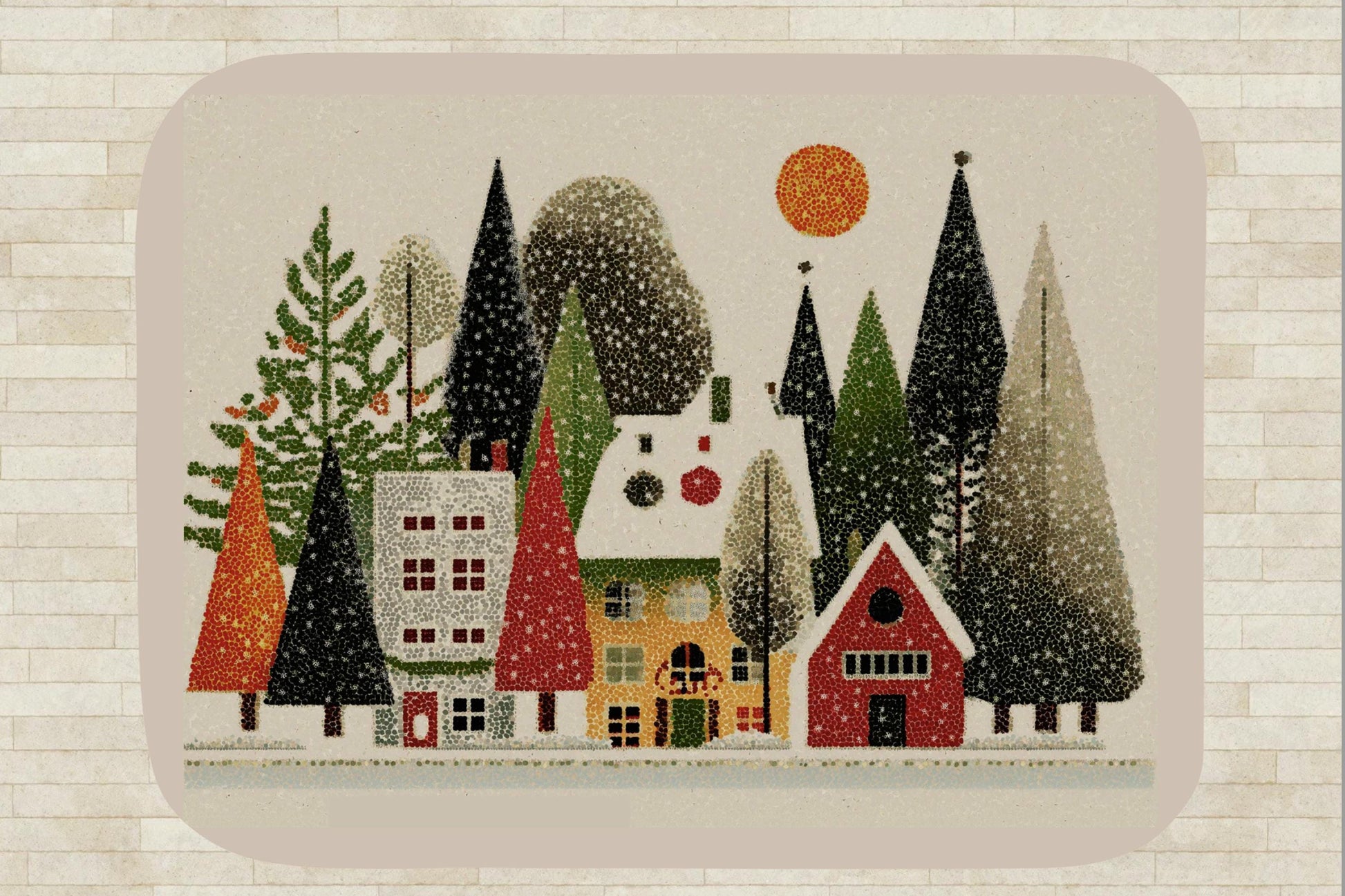 Warm holiday colors with a vintage-inspired village scene