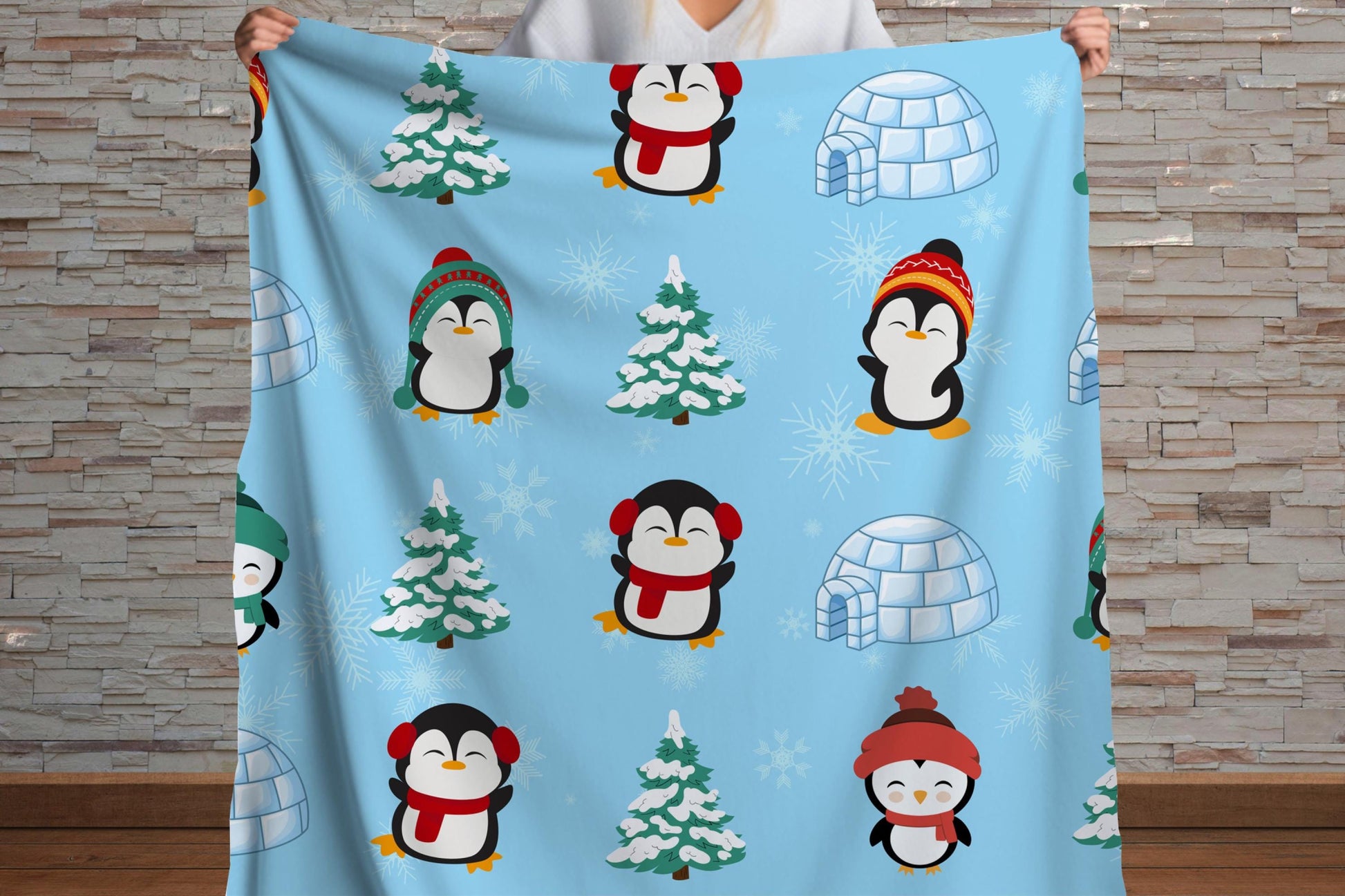 This adorable Penguin Christmas blanket features a seamless pattern of cute penguins in winter hats, igloos, snowy trees, and snowflakes on a light blue background—perfect for holiday decor or as a cozy winter gift. Made with ultra-soft Sherpa, it's ideal for snuggling on cold days or adding a festive touch to kids’ rooms and nurseries. This custom throw blanket comes in multiple sizes to suit your needs: