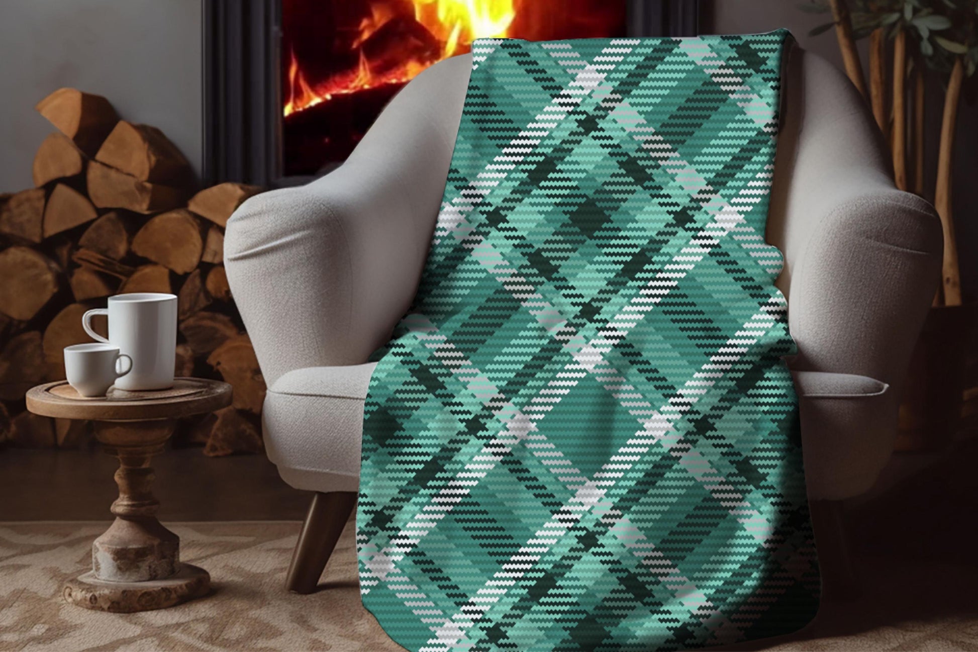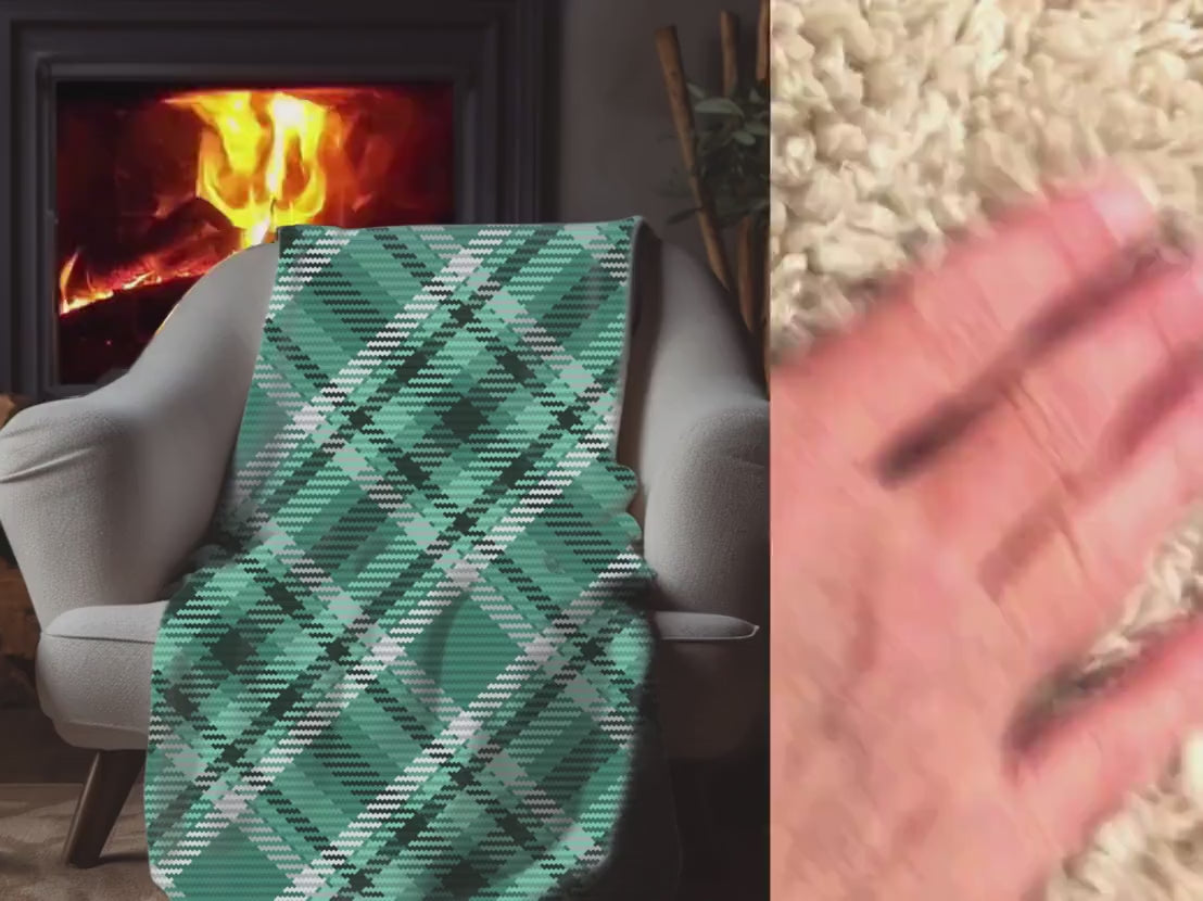 This sherpa blanket features a teal, black, and white plaid pattern with a knitted look—offering cozy warmth and timeless winter style.