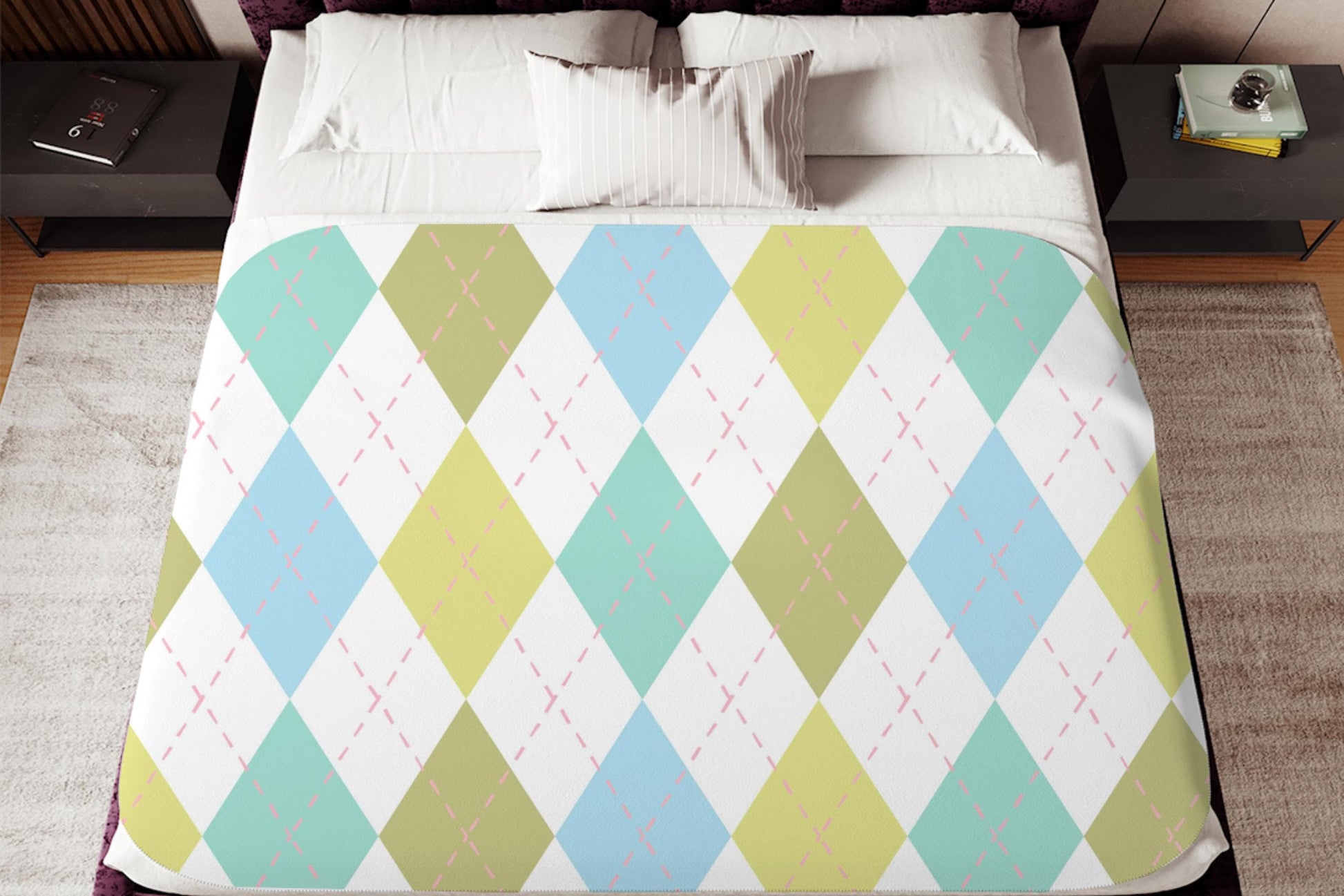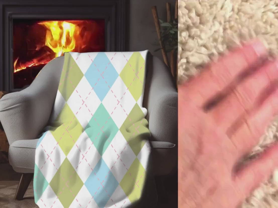 This sherpa blanket features a timeless argyle pattern in soft pastel tones of blue, green, yellow, and pink—perfect for cozy, classic style.