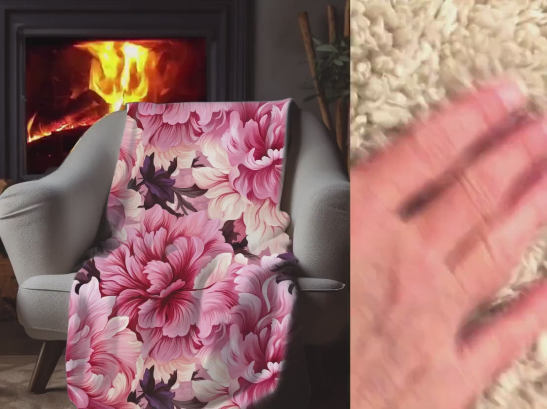 Romantic Floral Sherpa Blanket, Pink Peony Flower Throw, Cozy Plush Blanket for Her, Custom Gift, Feminine Bedding, Boho Home Decor
