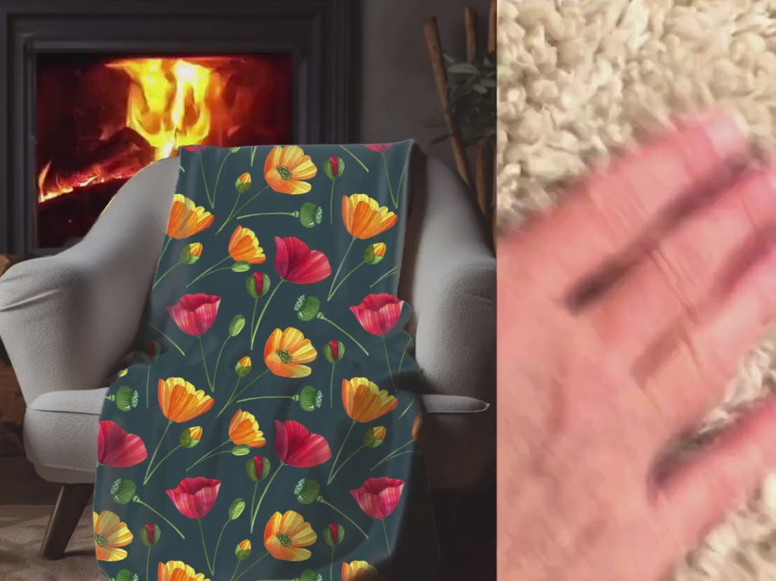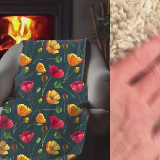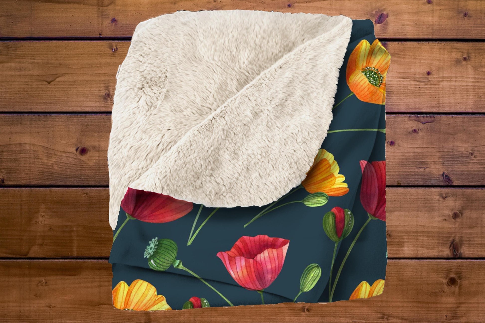 This sherpa blanket features hand-painted watercolor poppies in bold red and golden yellow on a deep navy background. Whether it’s draped over your couch, bed, or reading chair, this floral throw brightens any room with cottagecore charm.