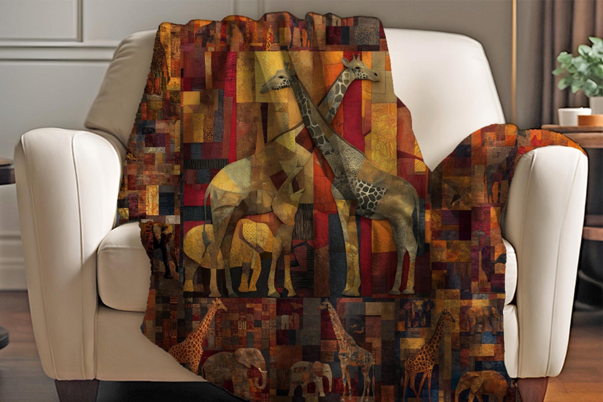 Safari Giraffe Patchwork Sherpa Blanket ā Warm Earth Tones, Elephants & African Wildlife Art