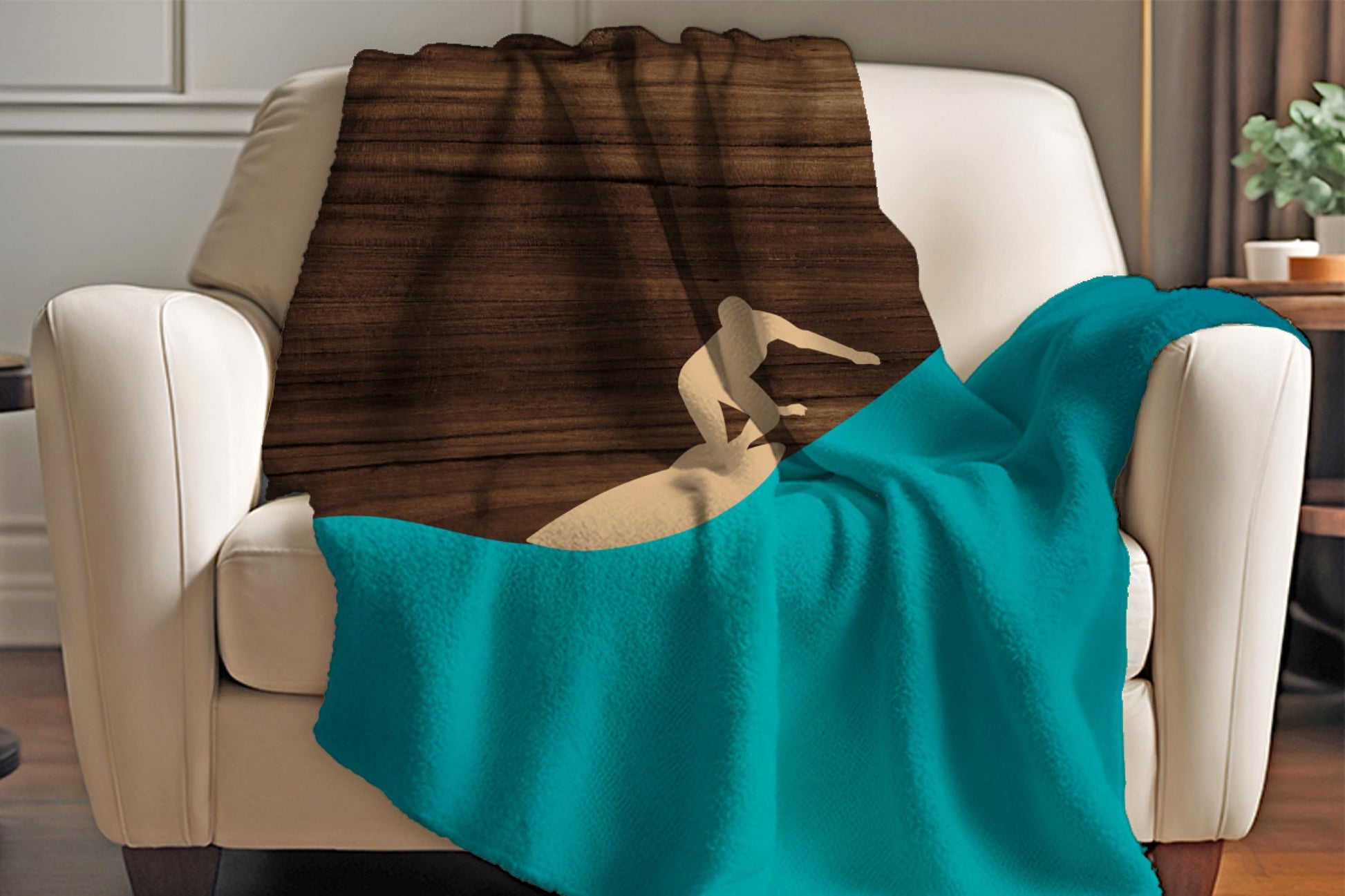 Surfer Wave Wood Art Blanket – Coastal Surfboard Silhouette on Ocean Wave and Woodgrain – Cozy Sherpa Throw for Beach Lovers