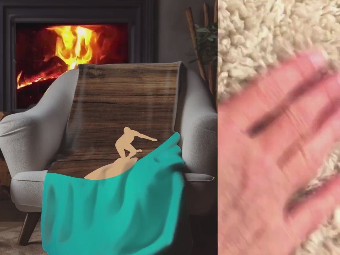 Bring coastal charm into your space with this unique sherpa blanket featuring a minimalist surfer silhouette gliding down a bold ocean wave, set against a warm woodgrain background. Ideal for beach lovers, surfers, and coastal home decor, this cozy throw combines modern art with natural textures. Perfect for gifting or curling up after a day on the water.