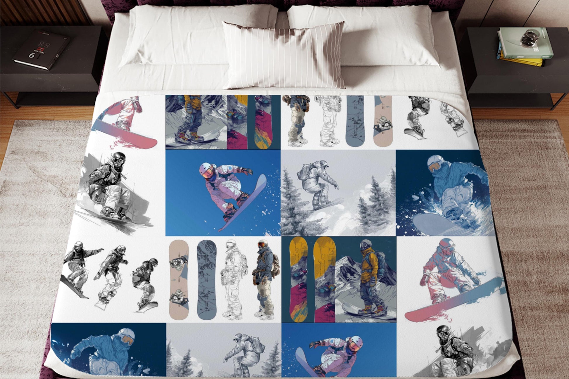 This snowboard-themed sherpa throw is crafted to bring both style and comfort to your home or cabin.