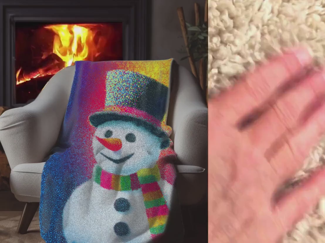 Colorful Snowman Sherpa Blanket – Whimsical Winter Decor in Pointillism Style, Cozy Holiday Throw for Christmas, Kids or Adults