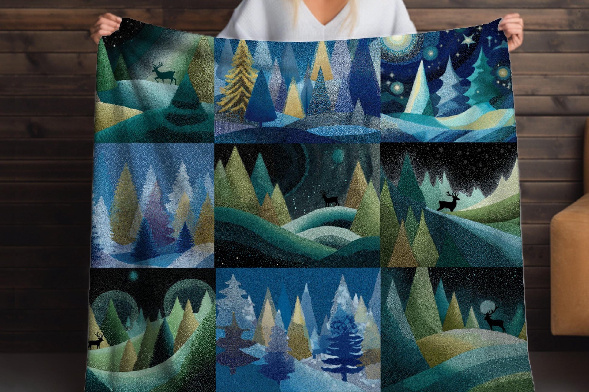 Wrap yourself in the magic of winter with our Reindeer Forest Sherpa Blanket, beautifully illustrated in a modern pointillism art style. This cozy and artistic sherpa throw features a collage of serene woodland scenes with majestic reindeer, frosted trees, and celestial skies in cool blues, greens, and golds.
