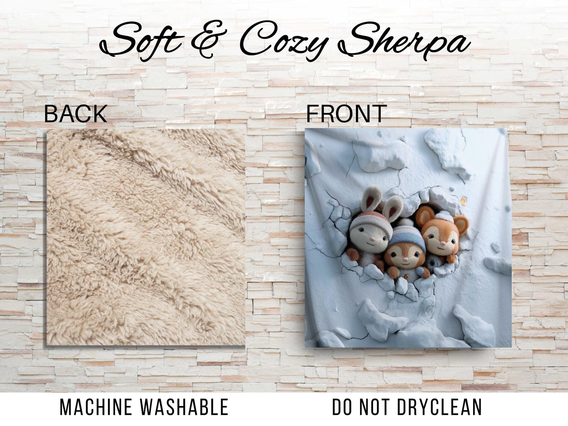 Bring warmth, charm, and winter wonder to your home with this Winter Woodland Friends Sherpa Blanket featuring three adorable plush pals — a bunny, a fox, and a bear — peeking out from a snow-covered forest hideaway. Wrapped in soft beanies and snuggly scarves, these woodland critters add the perfect cozy touch to any nursery, children's room, or holiday living space.