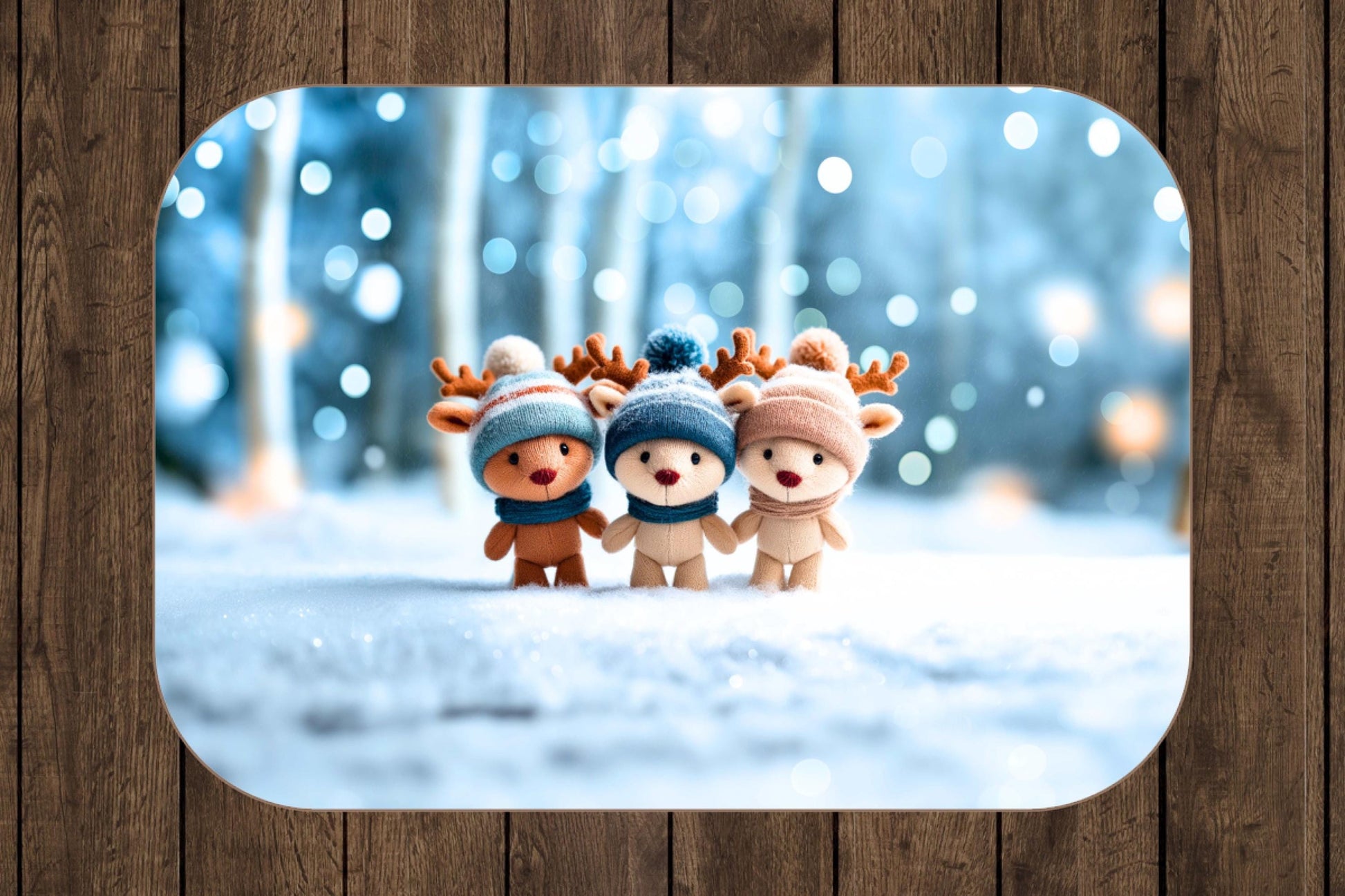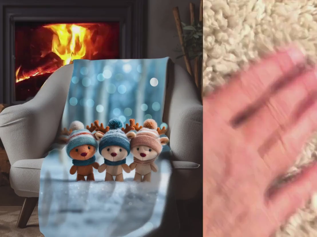 Snuggle into the magic of the season with this ultra-soft sherpa throw blanket featuring three adorable reindeer plush toys standing in a snowy winter wonderland. Their knit hats, button noses, and festive charm make this blanket the perfect holiday gift for kids, woodland nursery decor, or cozy Christmas cabin vibes.