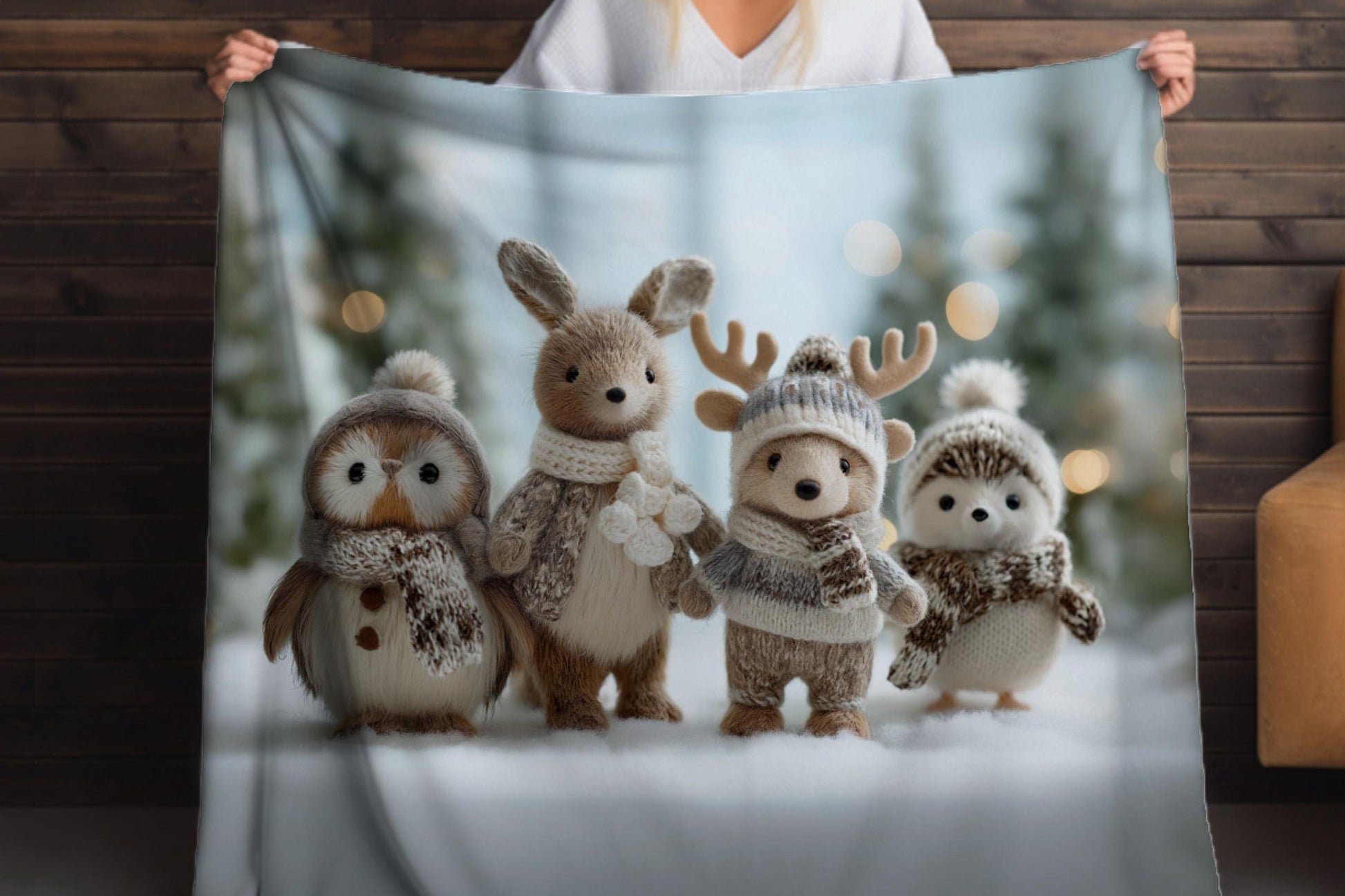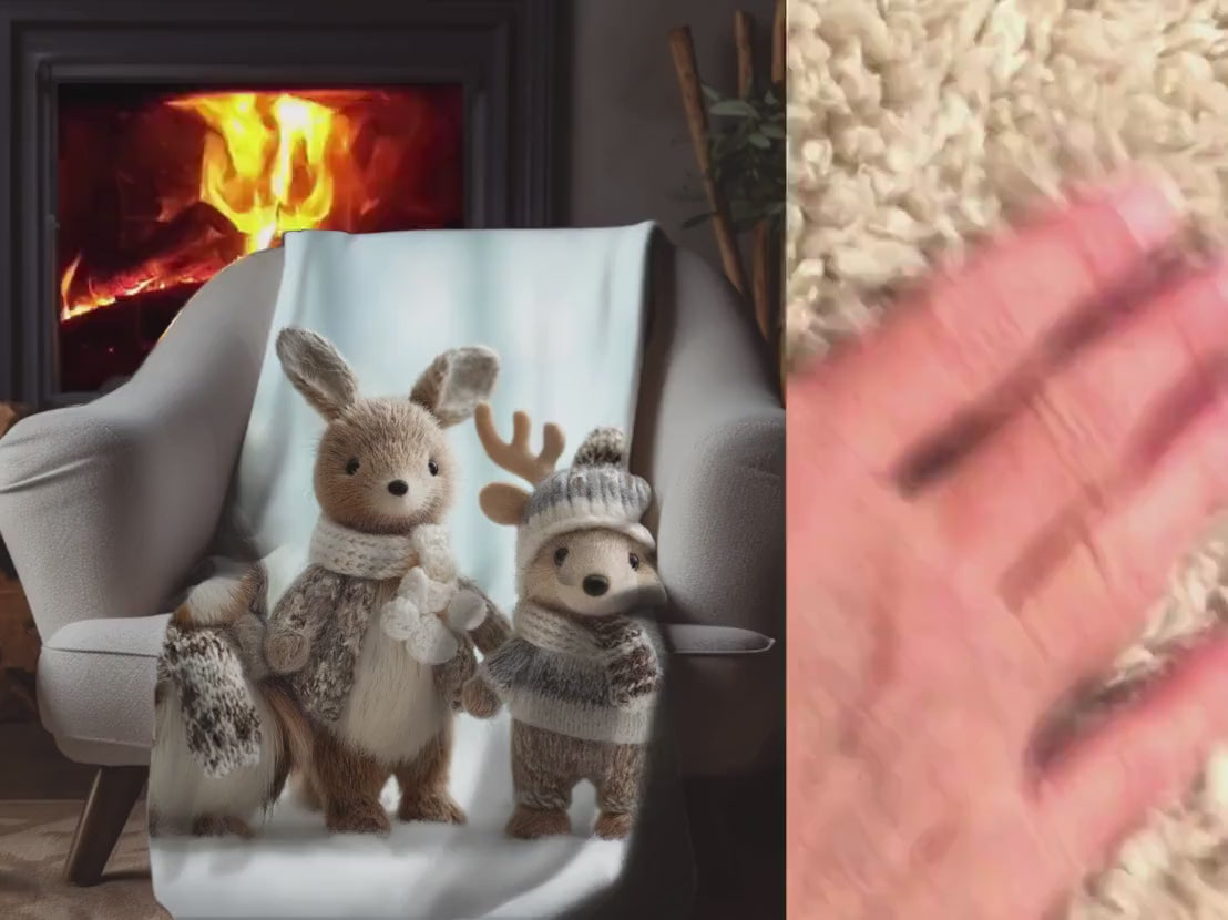 Wrap yourself or a loved one in wintertime wonder with this ultra-soft Sherpa blanket featuring a charming woodland Christmas scene! Four adorable plush animals – an owl, rabbit, reindeer, and hedgehog – dressed in cozy scarves and hats, bring warmth, whimsy, and holiday spirit to your home. This festive throw blanket makes the perfect Christmas gift for children, a cute winter nursery accent, or a cheerful touch to your cabin or living room.